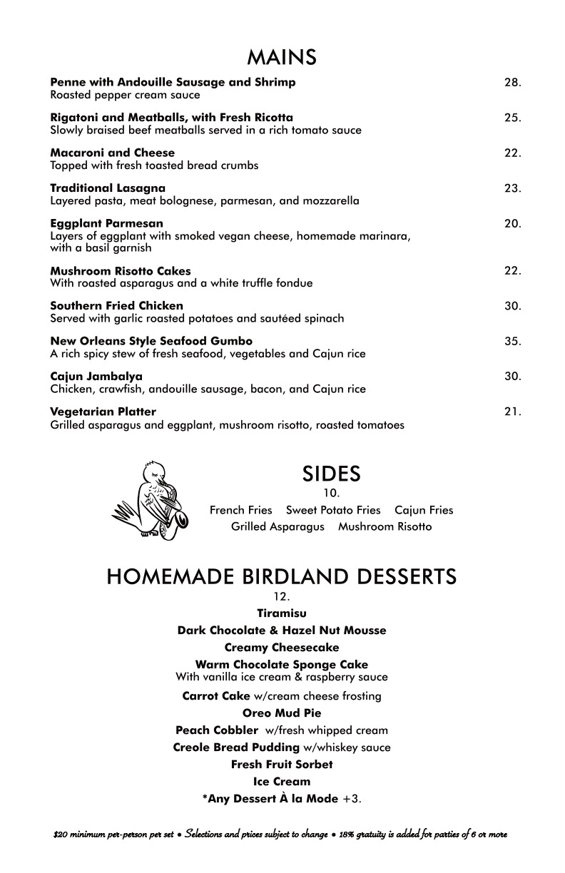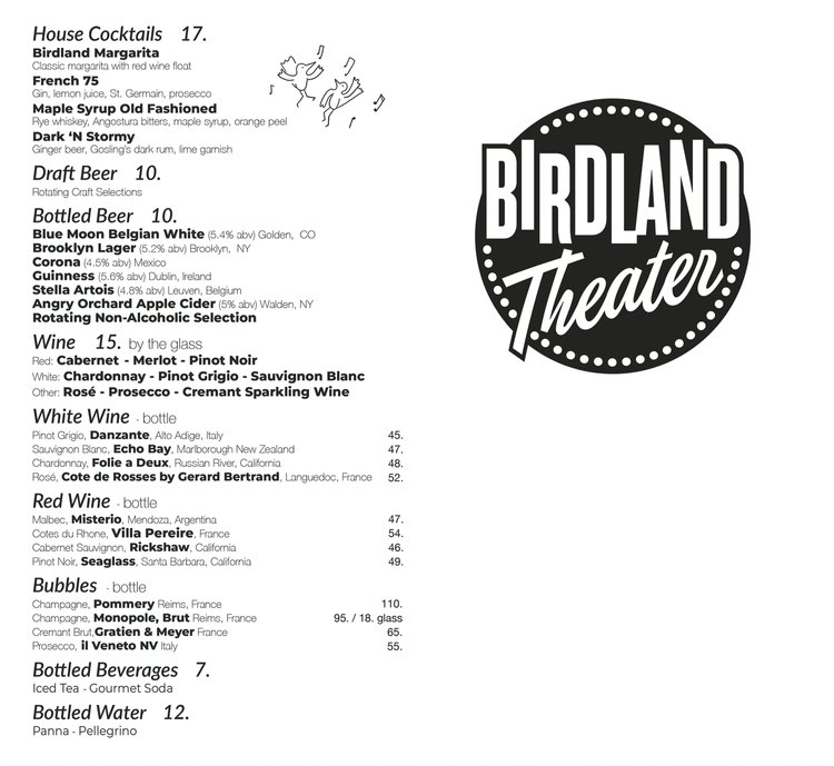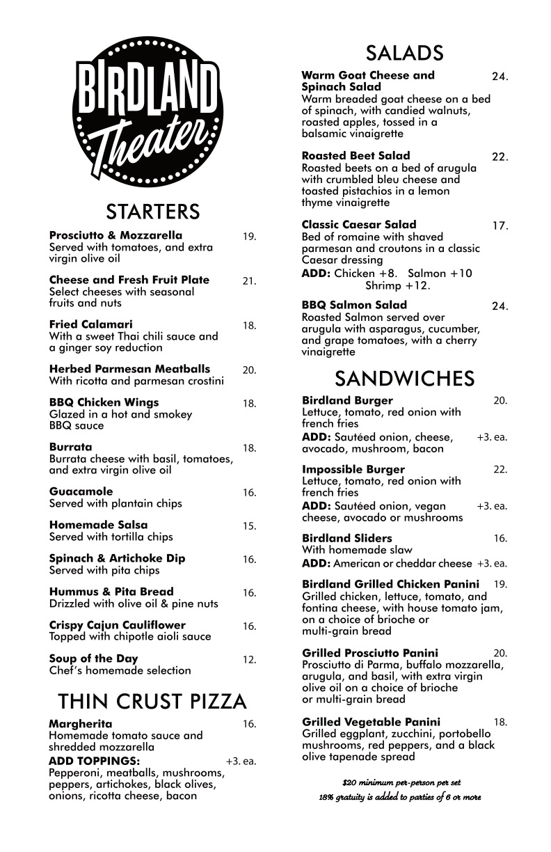 International Menus: Español Français Italiano 日本語 한국한 中国人 Birdland Theater Menu Make a Reservation Birdland is for ages 10+ $20 FOOD OR BEVERAGE MINIMUM PER PERSON, PER SET TICKETWEB IS OUR ONLY AUTHORIZED TICKET SELLER. ALL SALES ARE FINAL.